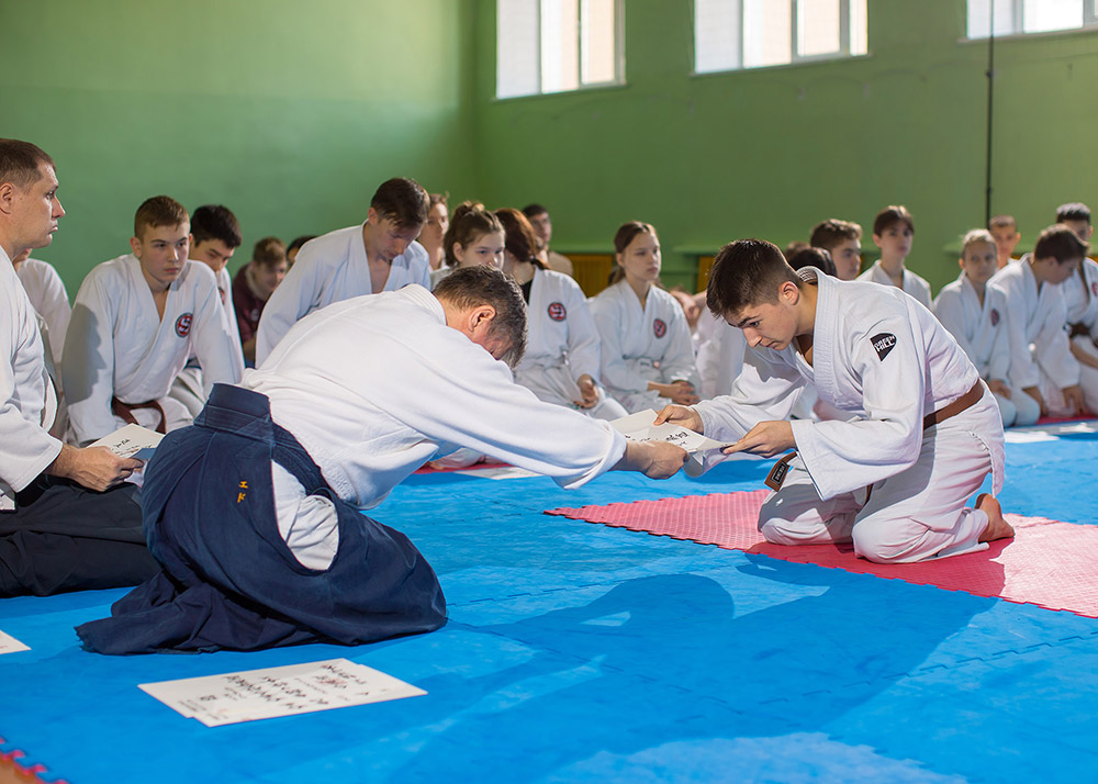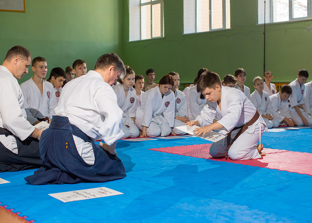 После небольшого перерыва спортсменам организации председатель Мезенцев Э.И. торжественно вручил японские документы — сертификаты, подтверждающие успешную пройденную аттестацию. В этот раз получили сертификаты на 5 кю — 17 человек, на 4 кю — 14 человек, на 3 кю — 16 человек, на 2 кю — 5 человек.